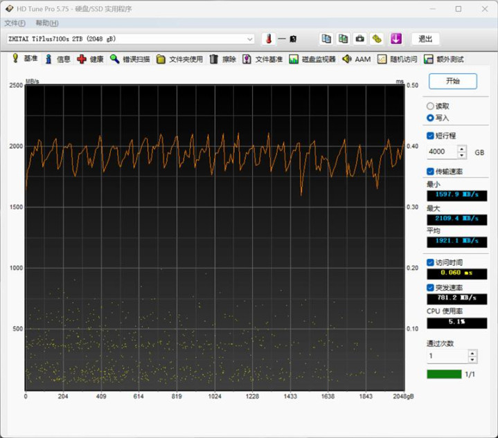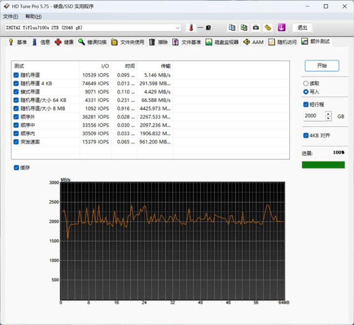 在HDTune软件中,可以测试不使用智能缓存的情况下的真实颗粒性能,可以看到在2000GB数据写入的过程中,TiPlus7100s 2TB SSD几乎一直保持了不低于2000MB/s的稳定速度。