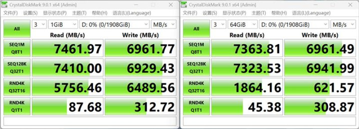 在CrystalDiskMark测试中,TiPlus7100s 2TB SSD在1GB和64GB的测试的结果非常接近。顺序读取速度达到了7461MB/s,写入速度也有6961MB/s;4K随机读取87MB/s,4K随机写入312MB/s。