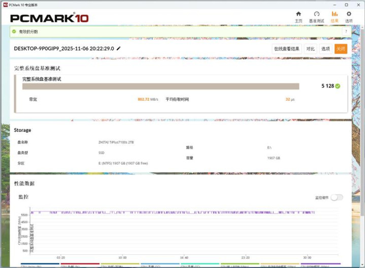 TiPlus7100s 2TB SSD在PCMark10的完整系统盘基准测试中,成绩为5128。