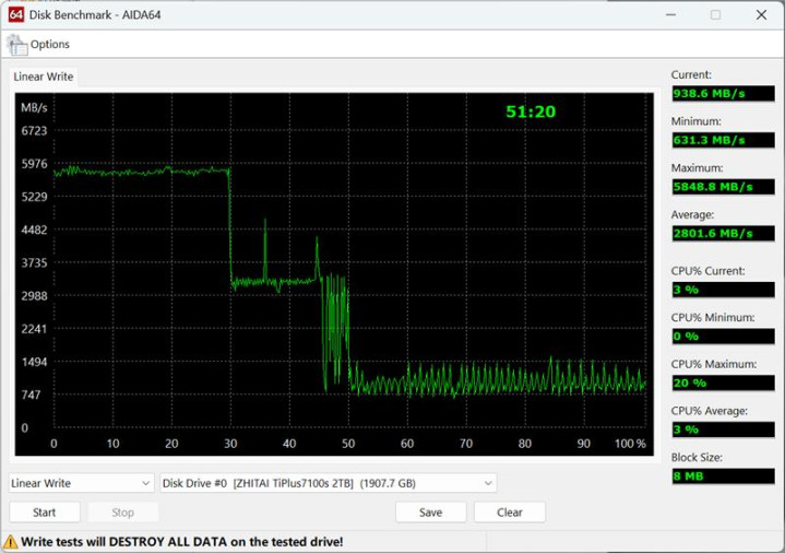 TiPlus7100s 2TB SSD在AIDA64储存基准测试中进行线型写入测试,这个测试会一直写入直到写满为止,无文件系统的情况下,可以测试SSD在不同剩余容量时的真实写入速度。
