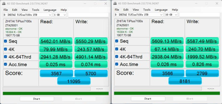 TiPlus7100s 2TB SSD在AS SSD Benchmark测试中,读取超过5400 MB/s,写入超过5600 MB/s。