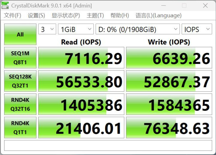 TiPlus7100s 2TB SSD的4K随机读取超过1400K IOPS,写入甚至超过了1500K IOPS,再次反向虚标。